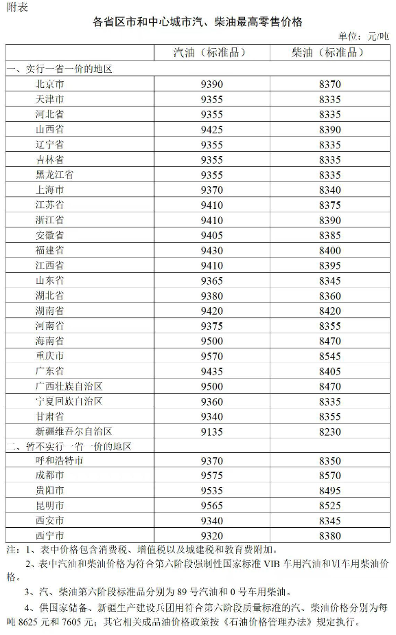 根据近期国际市场油价的变化,成品油价格按照现行机制进行调整。自2023年6月28日24时起,国内汽、柴油价格每吨均提高70元。调整后,各省(区、市)和中心城市汽、柴油最高零售价格见附表。相关价格联动及补贴政策按照现行规定执行。