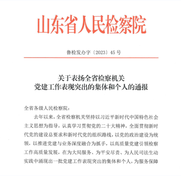 为了深入学习贯彻习近平新时代中国特色社会主义思想,全面贯彻落实党的二十大精神,扎实推进主题教育,弘扬伟大建党精神,庆祝建党102周年,进一步激励全省检察机关和全体检察人员立足岗位更好地发挥战斗堡垒和先锋模范作用,山东省人民检察院近日印发了《关于表扬全省检察机关党建工作表现突出的集体和个人的通报》,对党建工作表现突出的集体和个人予以通报表扬。其中,济宁高新区检察院政治部负责人张超获评全省检察机关党建工作表现突出的个人。