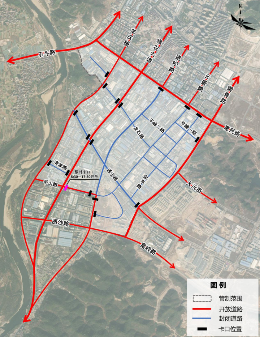 四、封闭时间段:化工园区各封闭卡口均为永久性封闭。绿谷大道-岑山路卡口为限时段卡口,开放时段为上午8点30分至下午17点30分。园区内各出入口将按照常规封闭化管控,其中园区各主要出口将在晚高峰时段自动开放道闸。