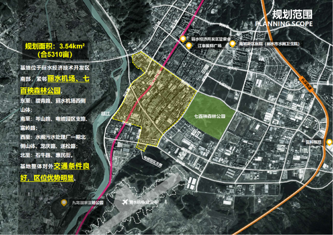 二、管理范围:东临缙青路,西至丽水机场西侧山体;南至岑山路,电镀园区支路,富岭路;北至石牛路,惠民街。
