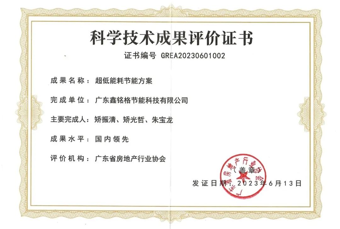 为了促进“四新”技术在房地产项目全生命周期中的评价、推广和应用,广东省房协科技评价委员会委员、粤海置地安全总监兼工程管理部总经理欧泗原担任组长,与副会长、中房百花园总经理伍云龙,越秀地产广州区域工程负责人蔡荣勋,中国电建南方区域总部工程管理部主任和丽钢,新建筑服务中心执行主任赖晋智组成专家组。在肇庆举行的“超低能耗节能方案”科学技术成果评价会议上,广东鑫铭格节能科技有限公司提供了相关支持。