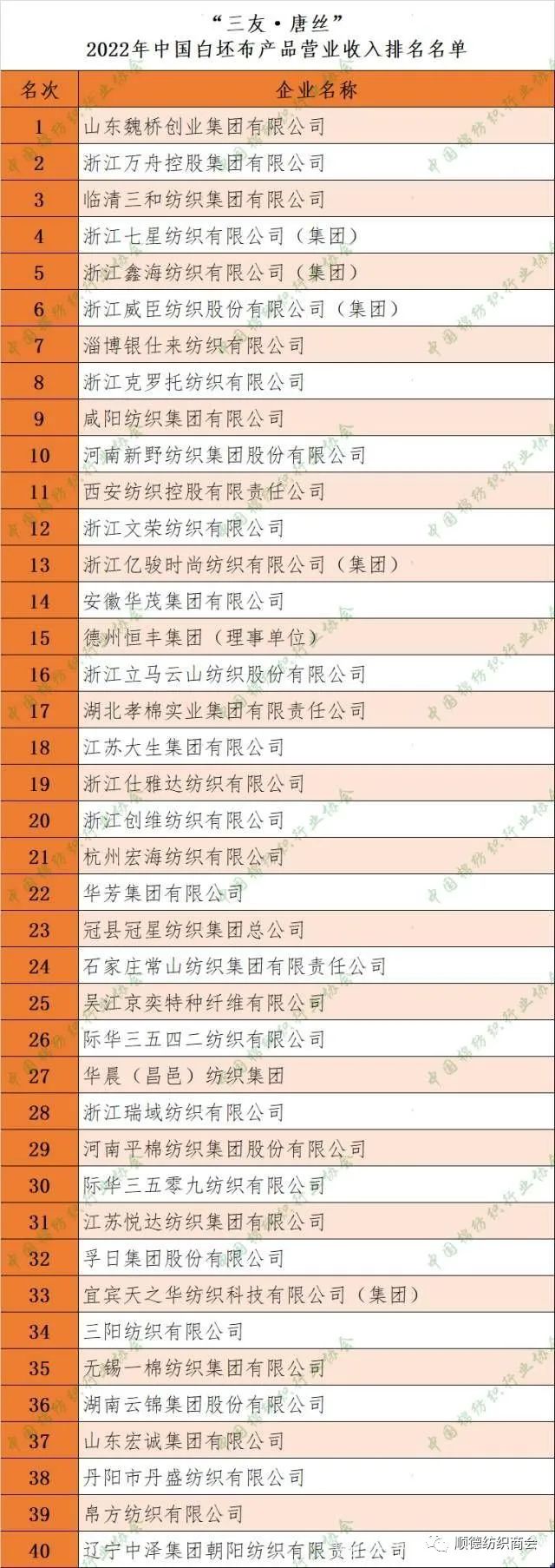 日前,中国棉纺织行业协会发布了“三友·唐丝”2022年中国棉纺织行业分类产品“白坯布前40名”、“色织布前10名”、“牛仔布前15名”企业名单。该名单向全社会公开,旨在促进纺织行业健康发展。