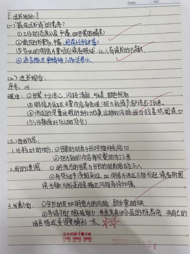 为了拓宽学生的阅读范围,学文校区七年级语文组在五一假期期间开展了“盲选主题书籍活动”活动。他们结合学生的阅读经验和兴趣,以教材第六单元“探险与科学幻想”为主题,鼓励学生在长假期间深入开展主题阅读,总结阅读心得,撰写推荐书目,制作图书盲盒,并在返校后进行评选。
