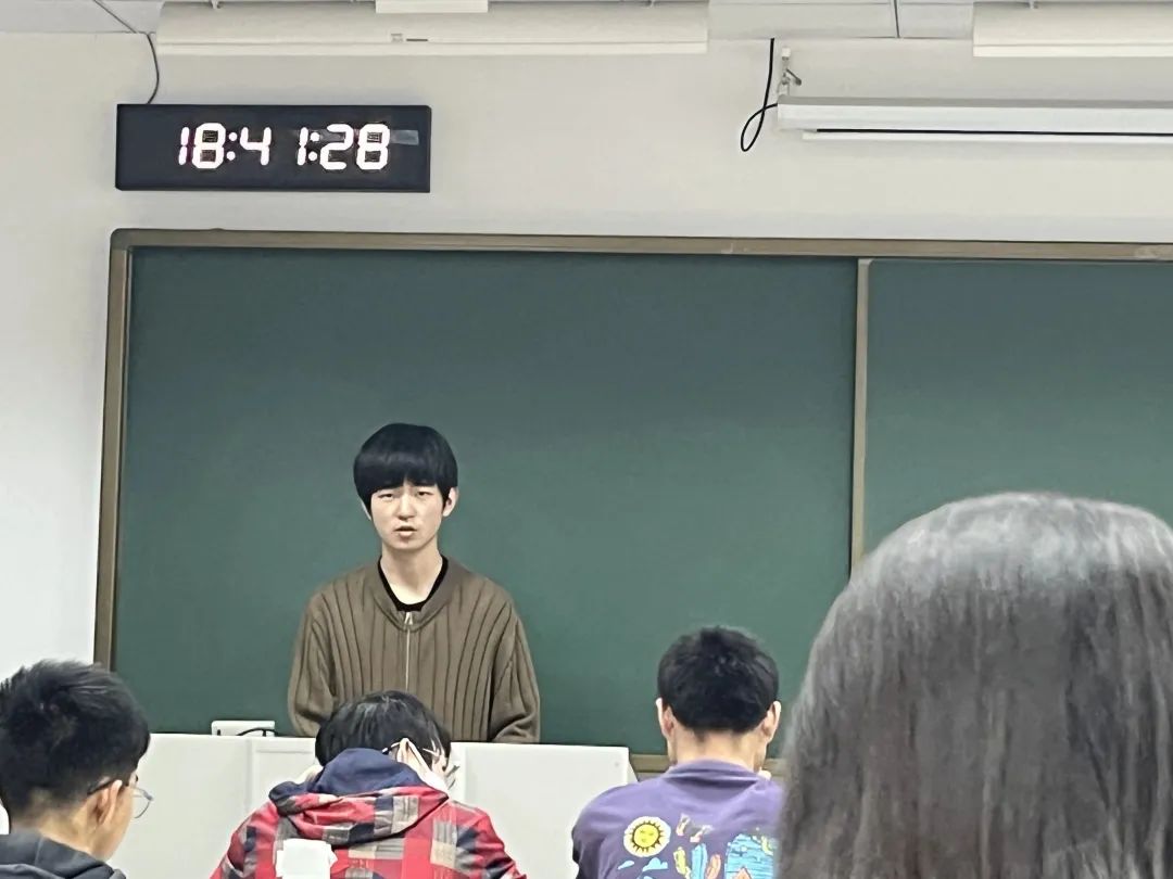 首先,我谨代表班级向大家表示祝贺,我们班荣获“优良学风班”称号。 大学时光是人生中最宝贵、最不可复制的青春年华。相较于高中,我们拥有更多自由支配的时间,可以快速成长为更加优秀的自己。在大家的共同努力下,我们打造了一个集学习、创造、团结、和谐于一体的优秀班集体。 希望你们继续发扬“不积跬步无以至千里,不积小流无以成江海”的刻苦学习精神,青年强则国家强。希望你们的青春在不懈奋斗、创新创造中迸发耀眼的光芒!