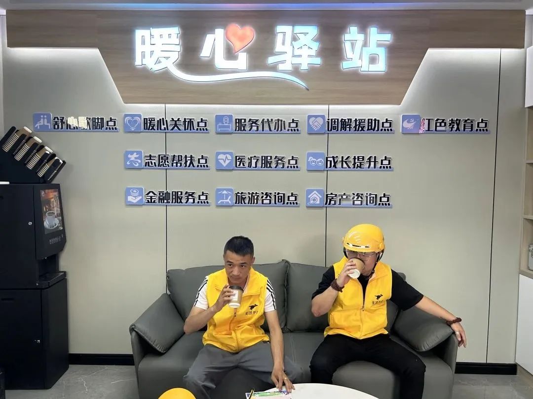 “暖心驿站”提供志愿帮扶、服务代办、暖心关怀、调节援助、成长提升等10余项服务项目。驿站内设有咖啡机、解忧箱、法律咨询、吐槽、专业医生帮帮团、心愿箱特色服务台、微波炉、书柜、药箱等设施齐全。在兼顾实用性的同时,营造出“家”的温暖氛围。驿站还向新业态新就业劳动者常态化宣传党的政策、收集民情等,开设“红色教育宣讲”和“悦读角”,定期开展红色宣讲,让新业态新就业群体在歇脚之余充电蓄能,也让党的二十大精神在新业态新就业群体中落地生根。