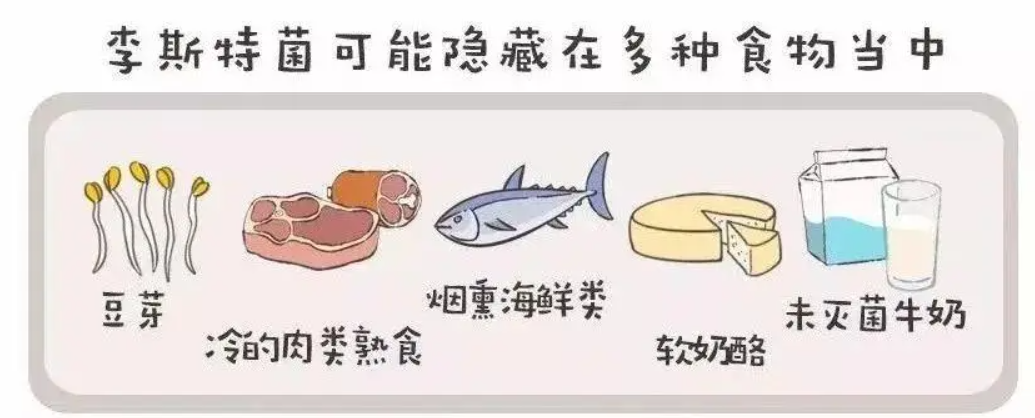 常见食物来源包括软奶酪、生豆芽、甜瓜、热狗、肉酱、熟肉、熏海鲜和生牛奶(未经高温消毒)。