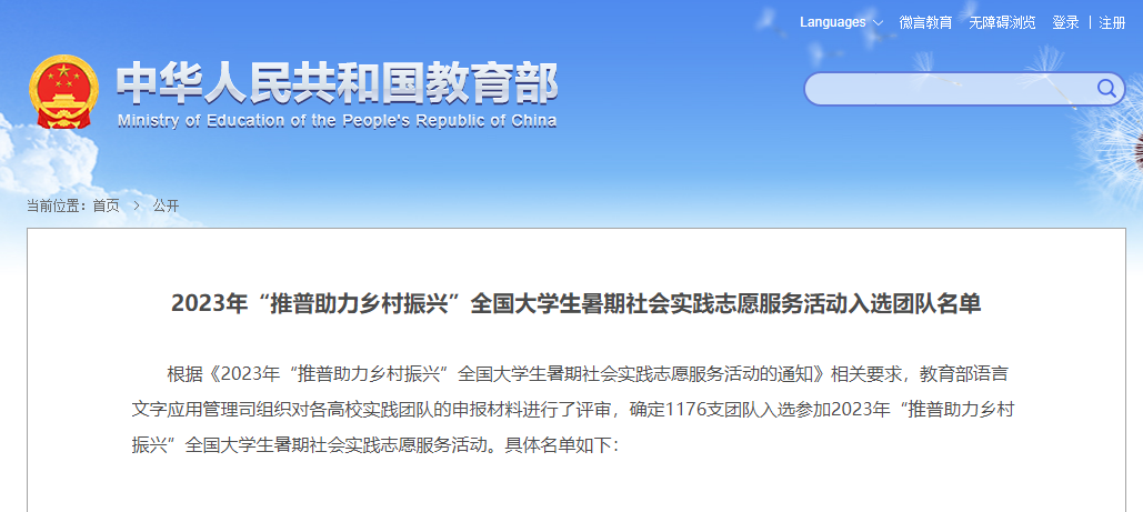 近日,教育部公布了2023年“推普助力乡村振兴”全国大学生暑期社会实践志愿服务活动入选团队名单,共有1176支团队入选参加。其中,黑龙江省有29个团队入选,其中包括齐齐哈尔市的3个团队。