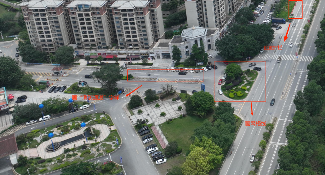 在碧桂园翡翠湾入口花圃处增设醒目的黄色网状线,规范停车。并在入口处的道路显著位置书写“消防通道”的黄色字样,同时在路边设置护栏,凸显该区域的重要性,提示严禁占用消防车道。