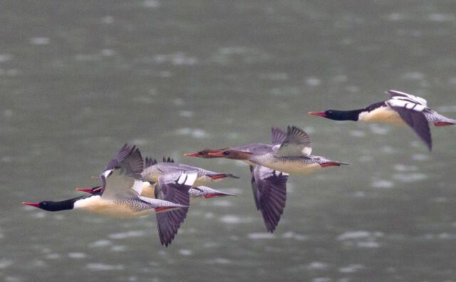 飞翔 中华秋沙鸭排成一字形在河道上空飞翔。王勇毅摄