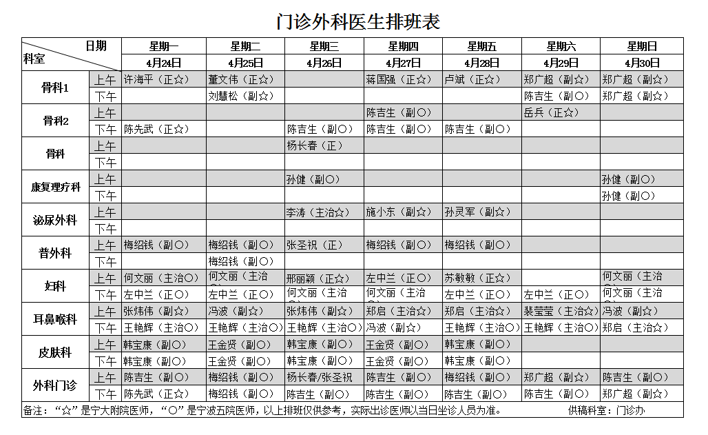 门诊信息丨宁波第五医院本周门诊排班表(4月24日~4月30日)