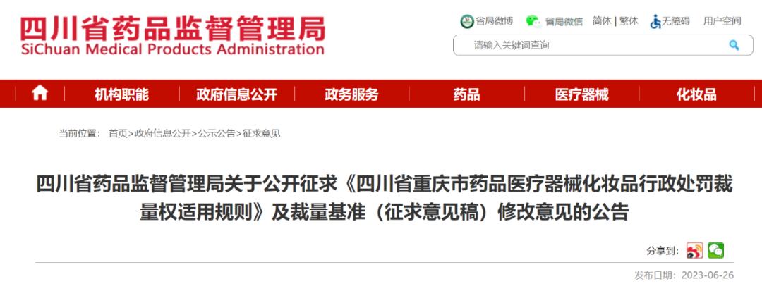 四川省药品监督管理局关于公开征求《四川省重庆市药品医疗器械化妆品行政处罚裁量权适用规则》及裁量基准(征求意见稿)修改意见的公告