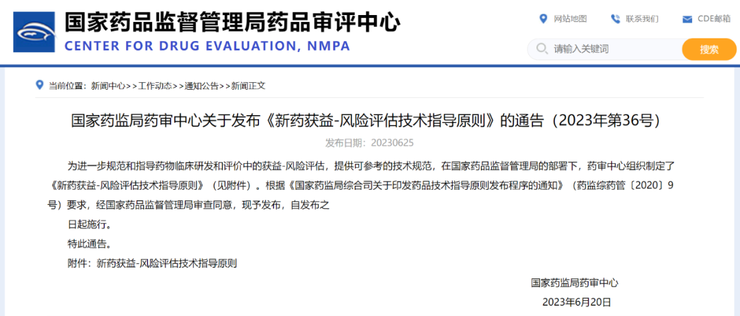 国家药监局药审中心发布了一份通告,名为《新药获益-风险评估技术指导原则》(2023年第36号)。