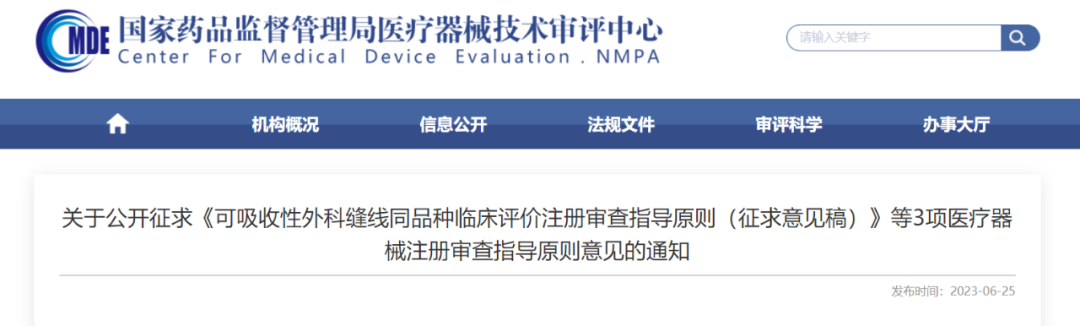 关于公开征求《可吸收性外科缝线同品种临床评价注册审查指导原则(征求意见稿)》等3项医疗器械注册审查指导原则意见的通知(国家药品监督管理局)