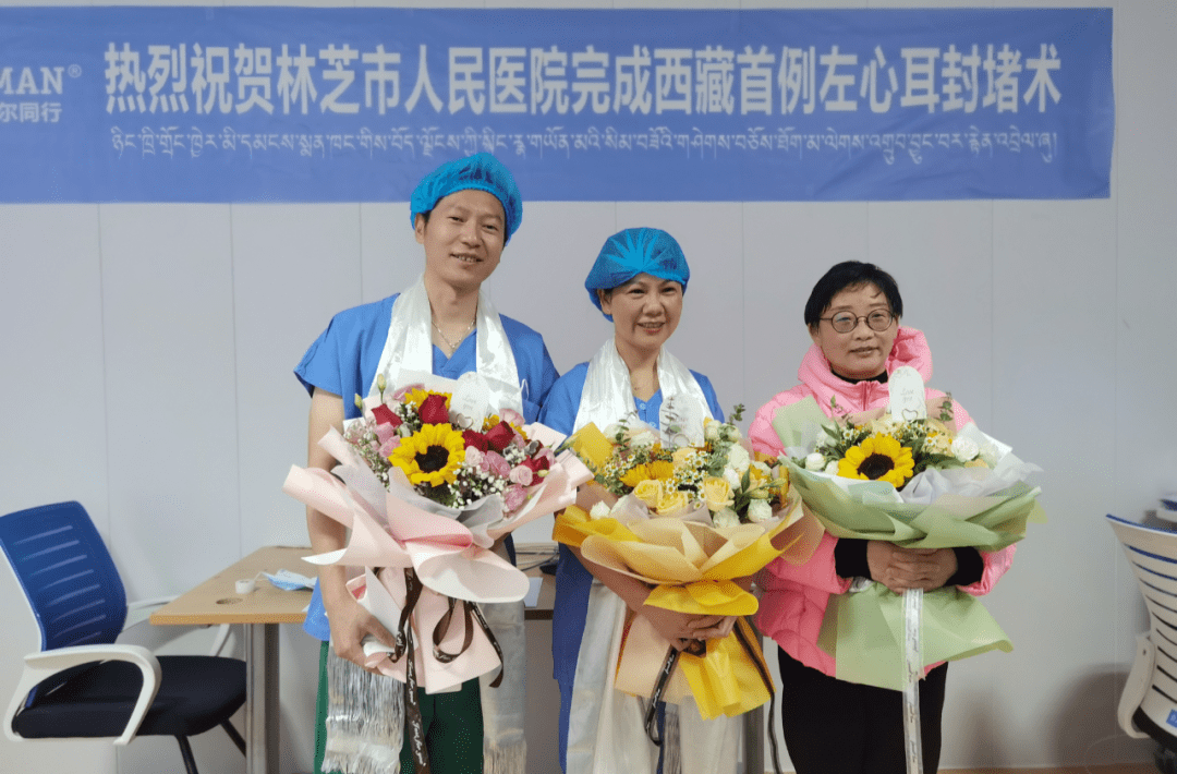 旺爷爷的家属为我院援藏队员韩萍副主任医师(右一)和林芝市人民医院全科医学科送上了锦旗。