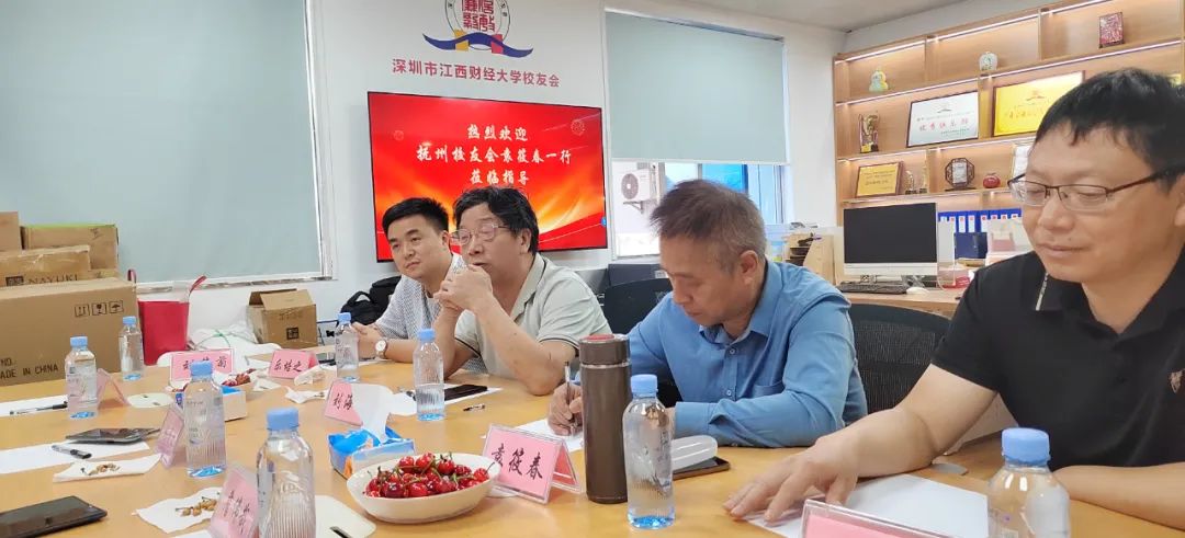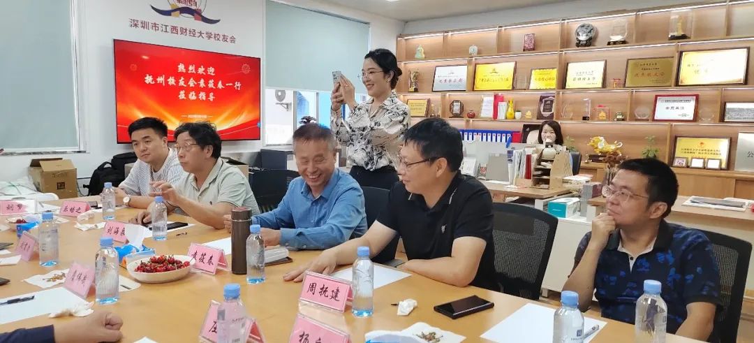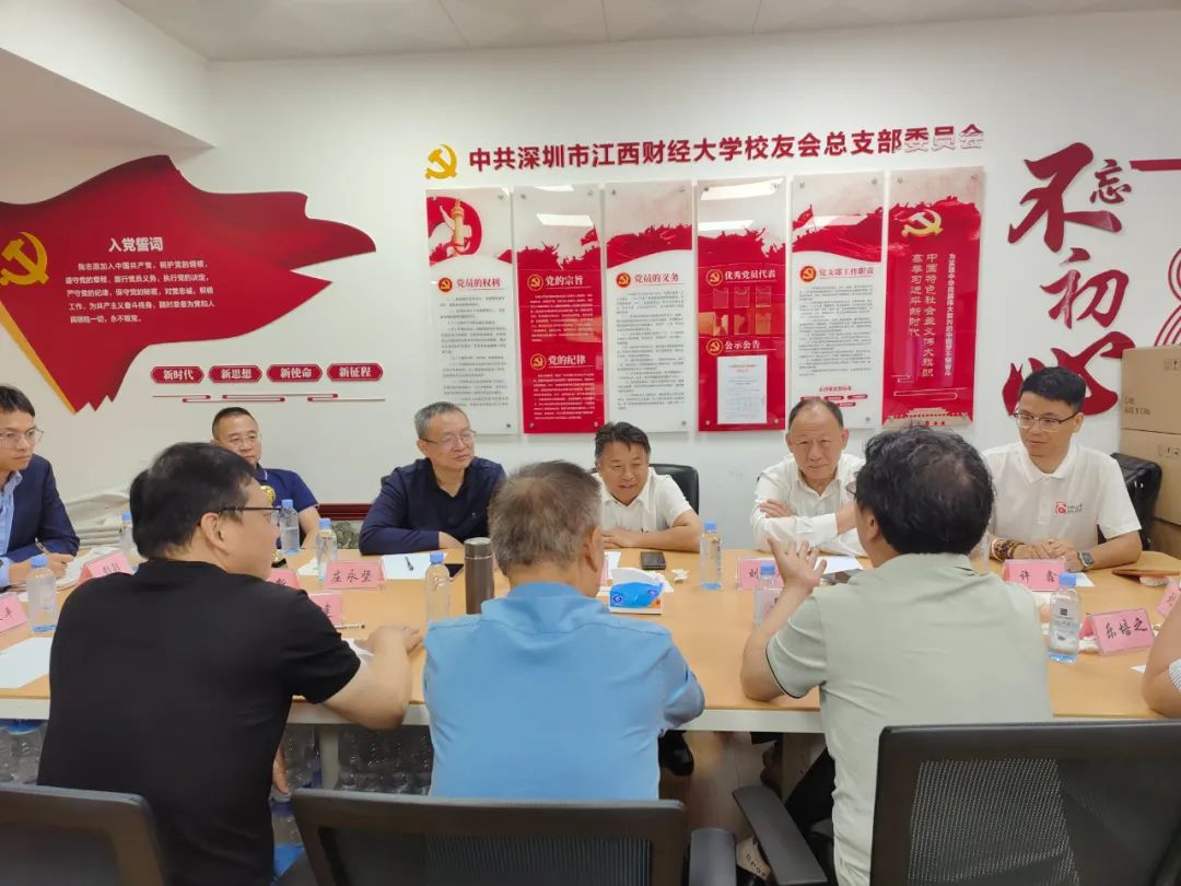 为庆祝母校百年校庆,江西财经大学抚州校友会秘书长袁筱春、抚州市围棋协会常务副主席兼秘书长刘海泉、抚州市法院周抚建、抚州市税务局乐培之等代表抚州校友会于2023年5月15日到访深圳校友会。与深圳校友会代表共同商讨了关于举办江西财经大学全国校友围棋赛事宜。 出席会议的深圳校友会代表包括江西财经大学深圳研究院院长吴良平、深圳校友会执行会长兼秘书长詹伟哉、执行会长杨高宇、深圳校友会艺术团团长刘贡力、深圳校友会常务副秘书长许鑫、深圳校友会围棋俱乐部名誉理事长庄永坚、理事长杨启新和秘书长彭颖。