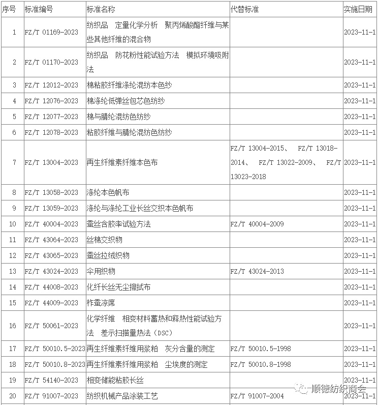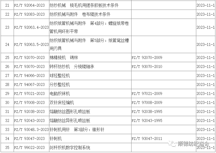 近日,工业和信息化部发布了2023年第7号公告,批准了586项行业标准和53项行业标准外文版。其中,纺织行业标准有35项(包括22项制定和13项修订),涉及纺织产品类和纺织机械类。这些标准将于2023年11月1日起开始实施。具体详情请参见下表。