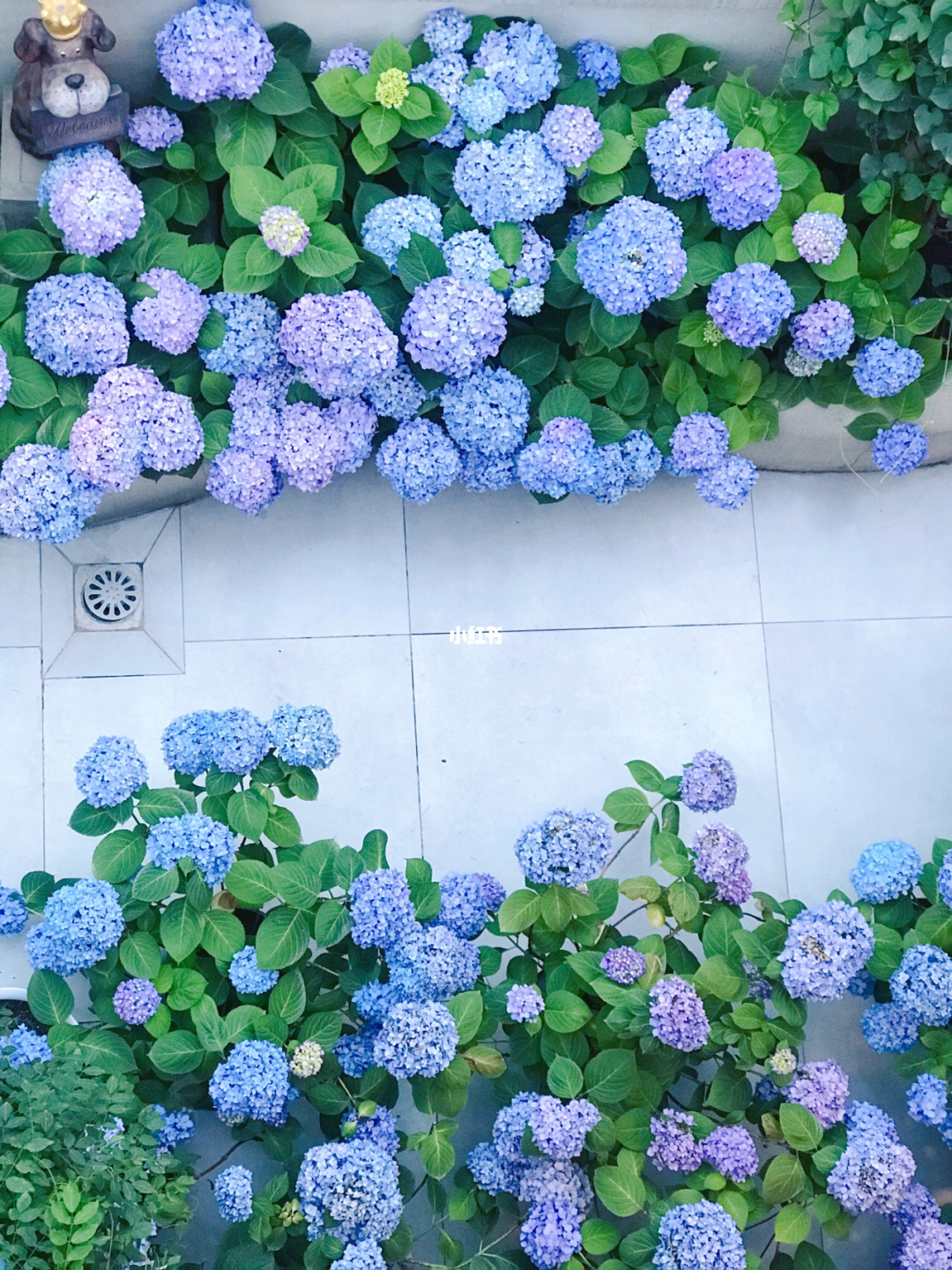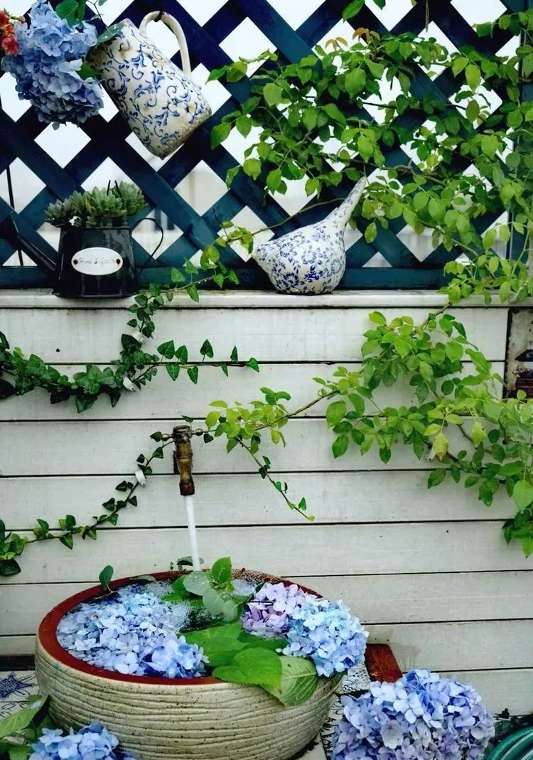 在栅栏的侧面种下一个梦幻的粉蓝色无尽夏。