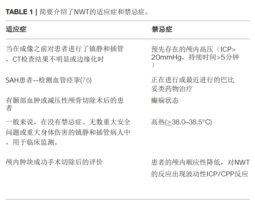 NWT仍然是评估脑损伤患者安全性和耐受性的必要条件。目前仅有少量文献报道,但大多数患者,包括那些NWT过程中出现ICP升高的患者,均具有安全性和耐受性。目前,预先存在持续颅内高压、癫痫状态、高热或巴比妥酸盐治疗的患者是NWT的绝对禁忌症。其他可能表明患者无法耐受NWT并需要仔细进行风险分层的指标包括血流动力学不稳定、近期心肌缺血、颅内顺应性降低、咪达唑仑镇静、躁动、插管控制、呼吸窘迫、癫痫活动或ICP/CPP反应不稳定。无法耐受NWT的进一步预测因素包括第一次造影时硬膜下血肿>5mmHg、初始GCS<5、检查中出现颤抖、心律失常或全身性血氧饱和度降低。在检查过程中出现ICP或CPP反应不稳定的患者必须逐个处理,并进行适当的风险-效益评估,同时采用多模态监测进行更仔细的评估。
