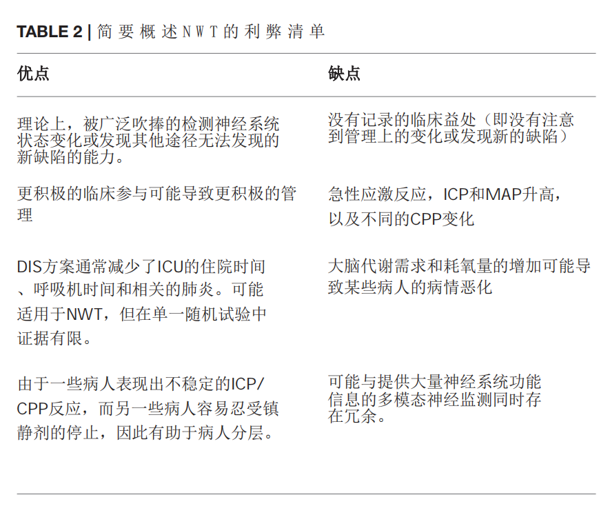 神经系统检查的可靠性、成本以及检测出多模态监测中未发现的细微缺陷的能力使得其成为必要的。多模态监测有助于确保在ICP升高或检查稳定的背景下,脑代谢和灌注/氧充足。这种监测可能对于禁用NWT的病人是必要的。它可能有助于个体化治疗,并在损伤完成前发现代谢窘迫。在一项随机对照试验中,ICP指导下的治疗并没有比单纯的临床检查和神经影像检查有更好的结果。总的来说,多模态神经监测应被视为对NWT的补充,反之亦然。需要更多的调查来确定NWT的绝对临床效用,特别是在病人结果和管理指导方面。表2列出了目前的优点和缺点。