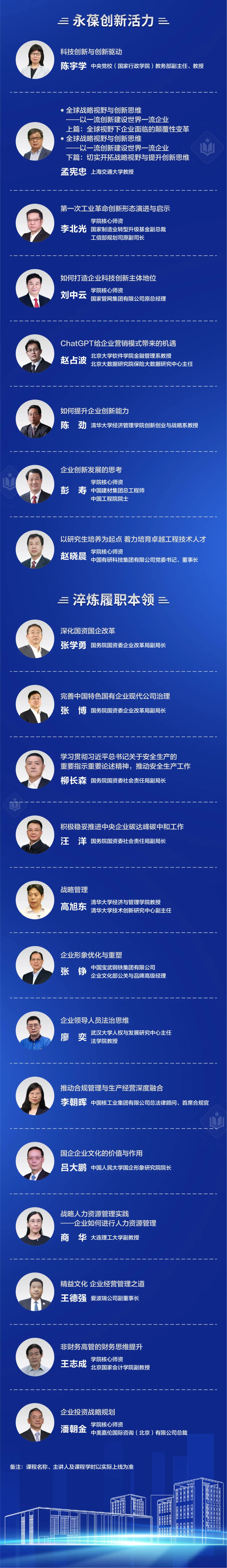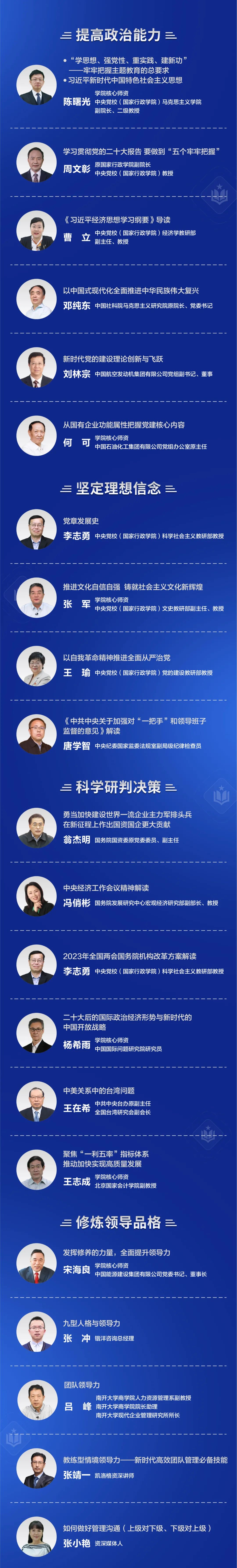 本期专题班以习近平总书记对国有企业领导人员提出的“20字”要求为指导,结合国有企业加快建设世界一流企业的战略要求。我们根据企业中高级领导人员的特点,重点围绕提高政治能力、坚定理想信念、科学研判决策、修炼领导品格、永葆创新活力、淬炼履职本领六个方面设计教学内容。这样,我们能够帮助学员拓展全球视野、把握前沿变革,系统学习经营管理知识工具与业界最佳实践。这将助力企业锻造具有专业思维、专业精神、专业方法的高素质专业化经营管理人才,为国有企业实现高质量发展提供人才保证和智力支撑。