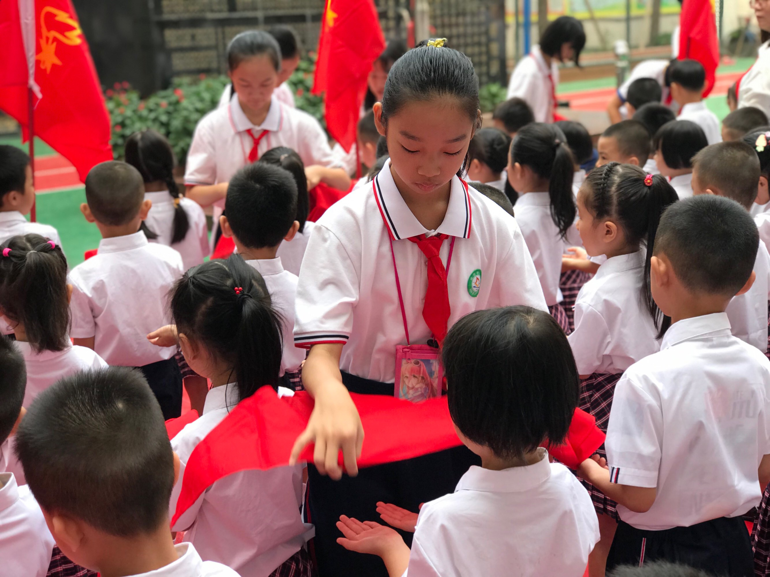 五年级的少先队员代表为新入队的少先队员佩戴红领巾。新队员们脸上露出了自豪的笑容。