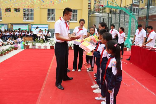 石阡县第二小学少工委主任兼校长张肄为一年级中队辅导员颁发了聘任证书,并为新建中队授予了中队旗。