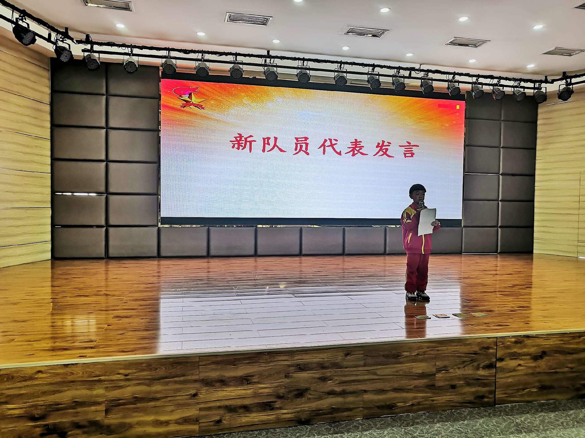 新队员代表廖伟铭激动地发言,他呼吁新入队的小伙伴们要以实际行动践行入队誓词,为胸前的红领巾增添新的荣誉!