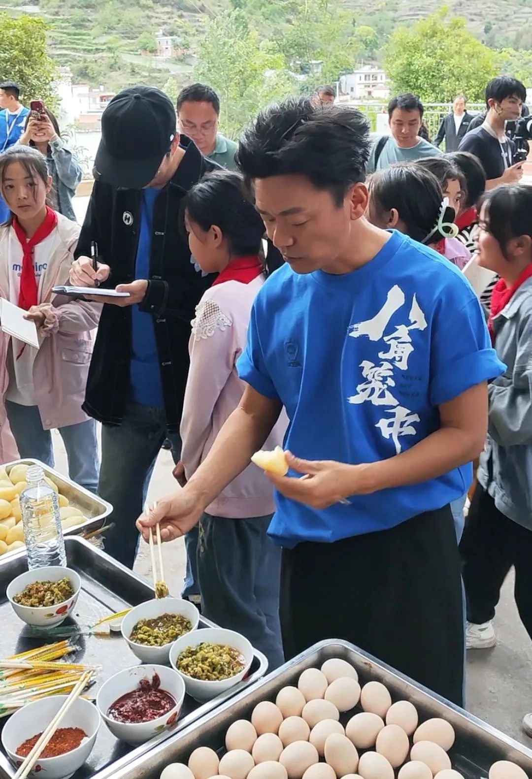 活动最后,王宝强和他的团队为孩子们带来了衣服、鞋子、牛奶等爱心物资,并祝福孩子们端午节快乐。孩子们用书画作品和家乡美食煮洋芋和乐业辣椒回赠王宝强,王宝强赞扬会泽大洋芋味道鲜美,乐业辣椒香气扑鼻,现场气氛和谐融洽。
