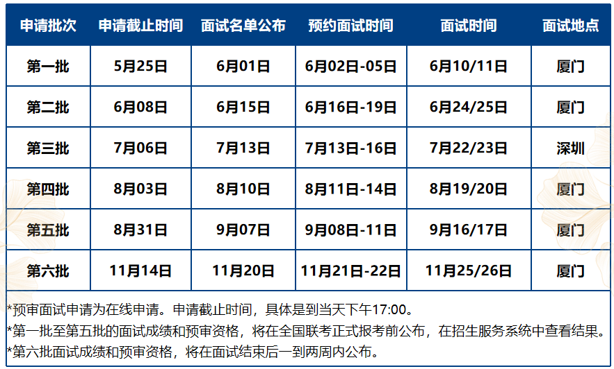 5、预审面试资格和成绩仅在当年有效。每位考生每年只能有一次预审面试成绩。一旦成绩有效,考生将不能再申请其他批次的预审面试。面试成绩将作为复试成绩使用。