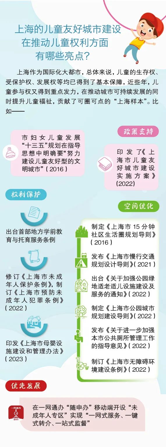 儿童友好城市建设承载着人民对城市美好生活的向往,也承担着对儿童未来和城市可持续发展的责任与使命。一个友好的城市对儿童来说就是一所更好的学校,一个更包容、更活跃、更具韧性的城市。在打造儿童友好城市的进程中,上海从政策、法律、福利、公共服务等方面进行了系统规划,形成了政府主导、部门协同、社会支持的创建格局。通过儿童优先、儿童参与、儿童友好来助推家庭友好、工作友好、社会友好,提升城市软实力。为了更好地宣传儿童友好理念,让每个儿童和成人都能理解儿童友好内涵和建设儿童友好城市的意义,市妇女儿童发展研究中心将加大理念宣传力度,提升全社会尊重儿童权利的意识,并呼吁将儿童友好理念融入城市规划建设中,营造适宜儿童成长的友好社会环境。