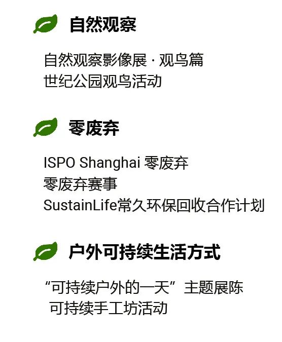 ISPO户外可持续展区,聚焦城市自然观察、零废弃及户外可持续生活方式。现场将带来: