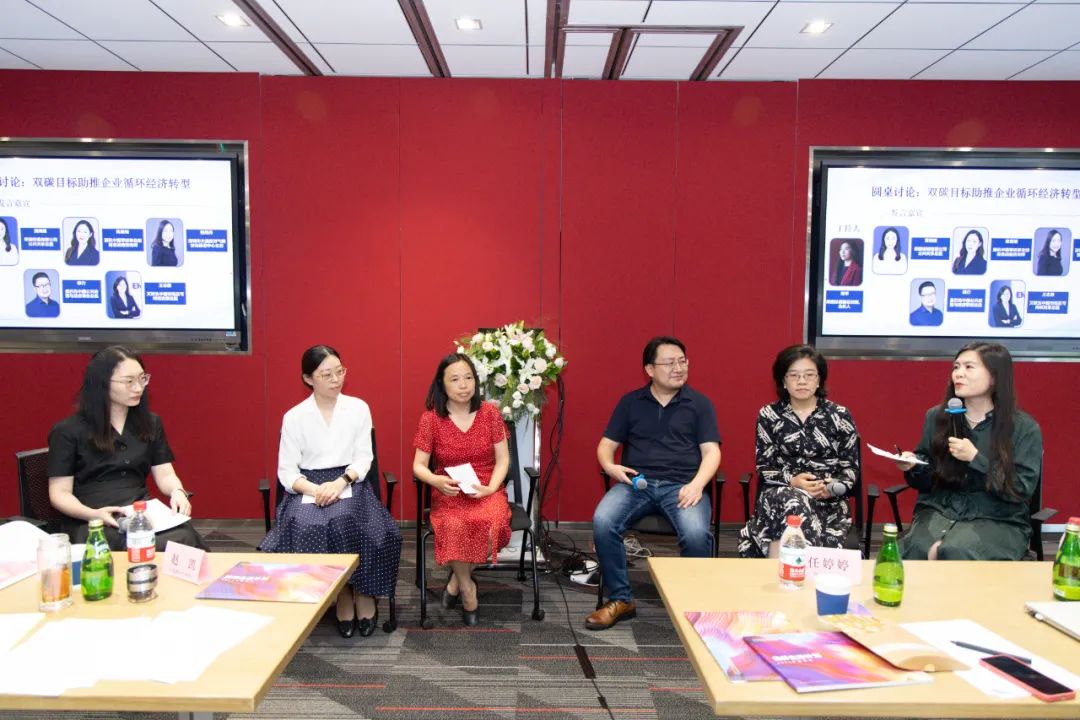 在最后的圆桌讨论环节,主持人郎华,商道纵横副总经理兼合伙人,与嘉宾黄婉晴,荣耀终端有限公司公共关系总监,陈慧娟,源讯中国零碳事业部首席战略咨询师,杨培丹,深圳市大道应对气候变化促进中心主任,徐力,星巴克中国公共政策与政府事务总监,王志慧,艾默生中国市场及可持续发展总监,围绕“双碳”目标对促进循环经济转型的作用、全价值链的减排路径及措施、企业(产品)创新方案等话题进行了交流。
