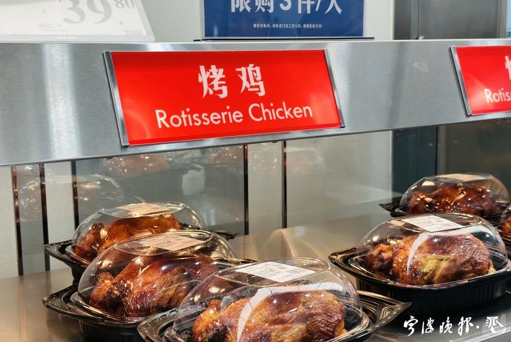 值得一提的是,在首层熟食区域,39.8元一只的烤鸡,在山姆也是需要“排长队抢购”的招牌产品,尽管货架上标识着“每人限购3件”,但实际上可随到随买,不需要排队。在10公里之外的宁波开市客,同样是39.8元一只的烤鸡,目前依旧是“排队王产品”。