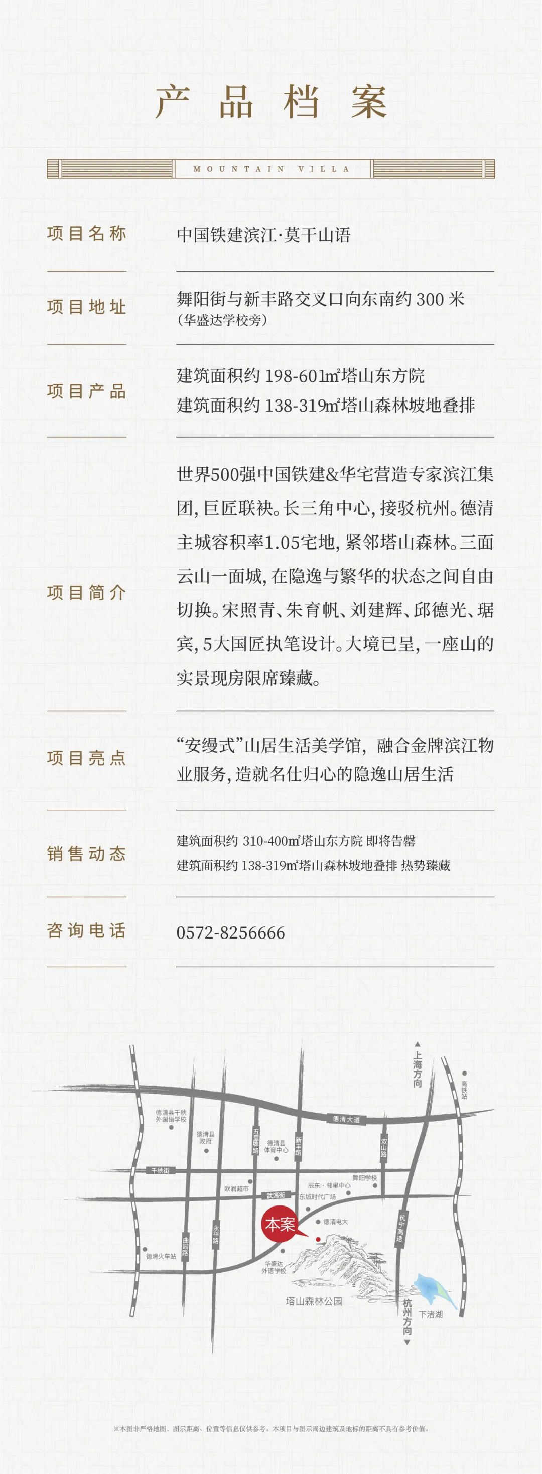 推广名为“莫干山语”,核准地名为“莫干山语城”。德售许字(2019)第00522号、德售许字(2019)第00682号、德售许字(2020)第00055号、德售许字(2020)第00222号、(德)售许字(2021)第ZJ00203号。 本宣传资料为要约邀请,相关内容可能会因政府相关规划、规定及开发商未能控制的原因而发生变化。泳池、健身房、瑜伽室等场所、设施均由开发商开放,委托第三方经营。经营者可根据实际情况自行确定经营范围、经营时间、服务对象和服务内容及价格等。 非产品所有外立面均为石材干挂。买卖双方的权利义务以政府部门最终批准文件图则、双方签订的《商品房买卖合同》及附件、补充协议约定为准。本文中提到的面积数据均指建筑面积。空间功能仅供参考,实际公寓功能空间以政府最终批复为准。本公司保留对宣传资料修改的权利,并于资料发布日期1个月内有效。客户急速响应专线:4009267919。
