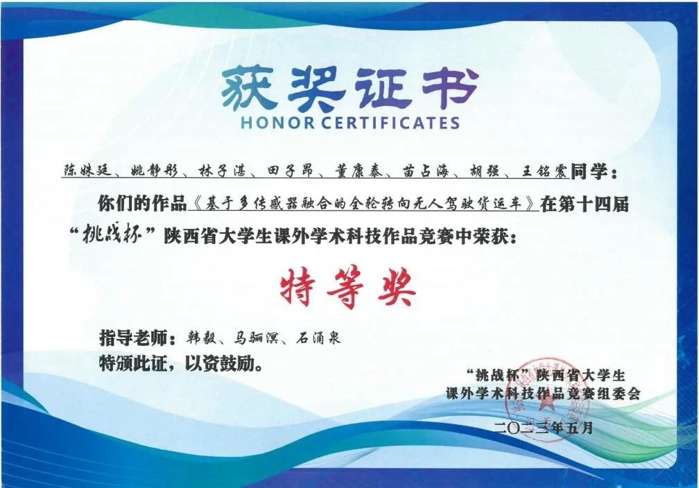 在第十四届“有志者,事竟成,破釜沉舟,百二秦关终属楚;苦心人,天不负,卧薪尝胆,三千越甲可吞吴。”竞赛中,陈姝廷团队的《基于多传感器融合的全轮转向无人驾驶货运车》项目在陕西省大学生课外学术科技作品竞赛中取得了优异的成绩。该项目采用了多传感器、无线充电和全轮转向创新技术,实现了无人驾驶货运车的高速高效运行。作为长安大学参赛团队之一,该团队将在第十八届“挑战杯”国赛中继续努力,争取获得更好的成绩。