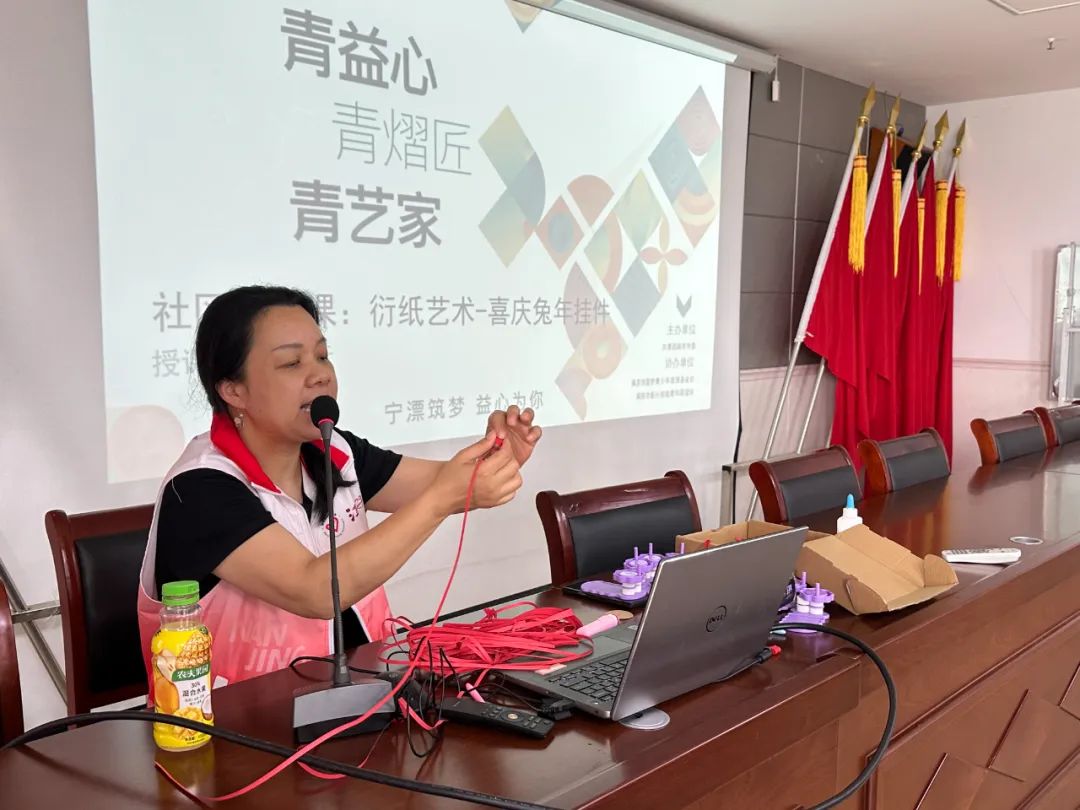 6月3日,淳化街道科苑社区新时代文明实践站与“宁漂筑梦益心为你”青年公益课合作,举办了一场青少年手工文化活动。活动邀请了艾云老师担任主讲人,共同探讨衍纸艺术——喜庆兔年挂件制作。通过亲身参与制作衍纸文化作品,孩子们能够更深入地感受传统艺术的魅力。