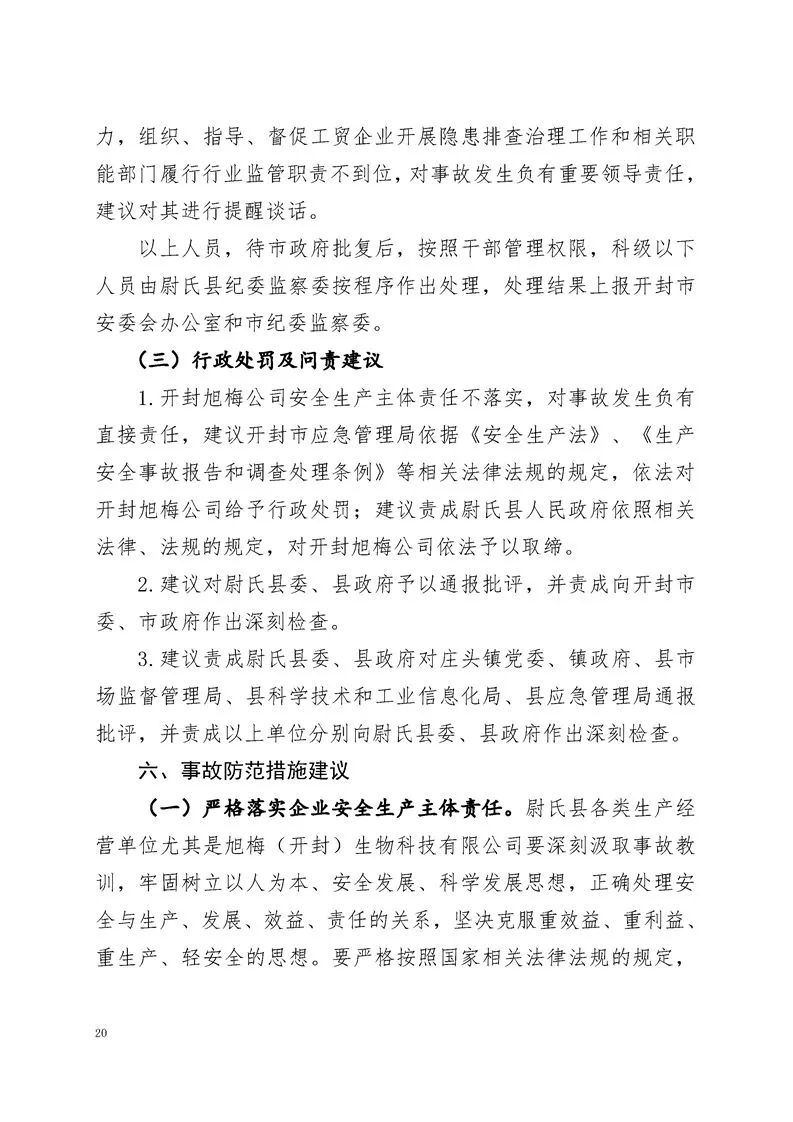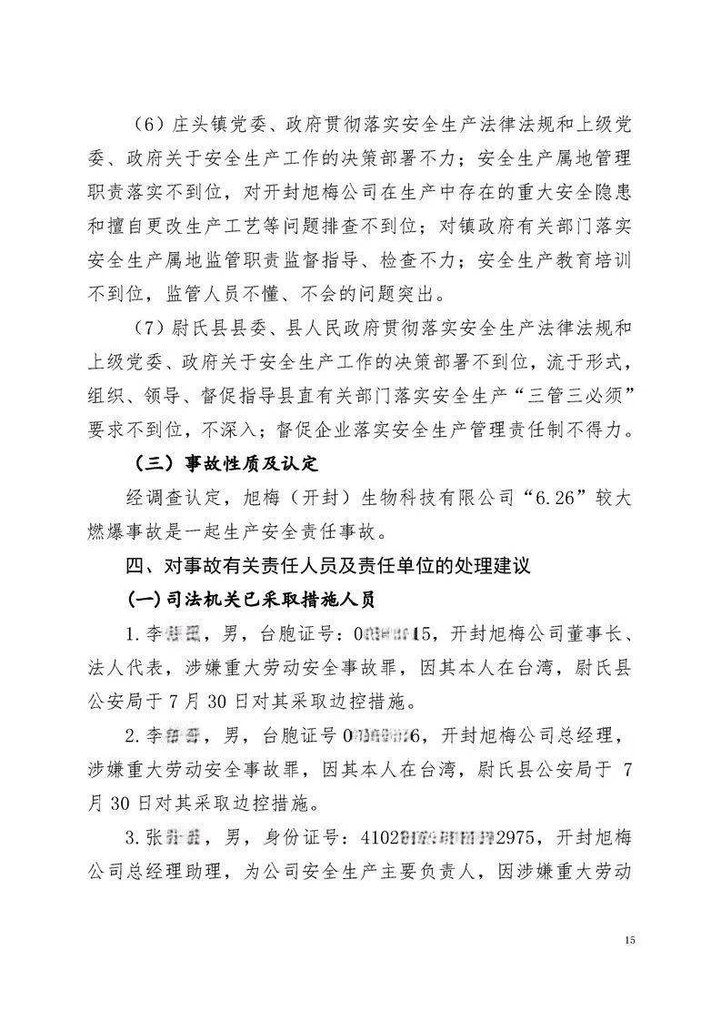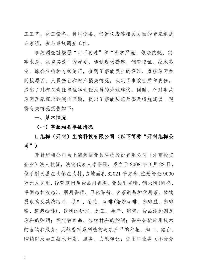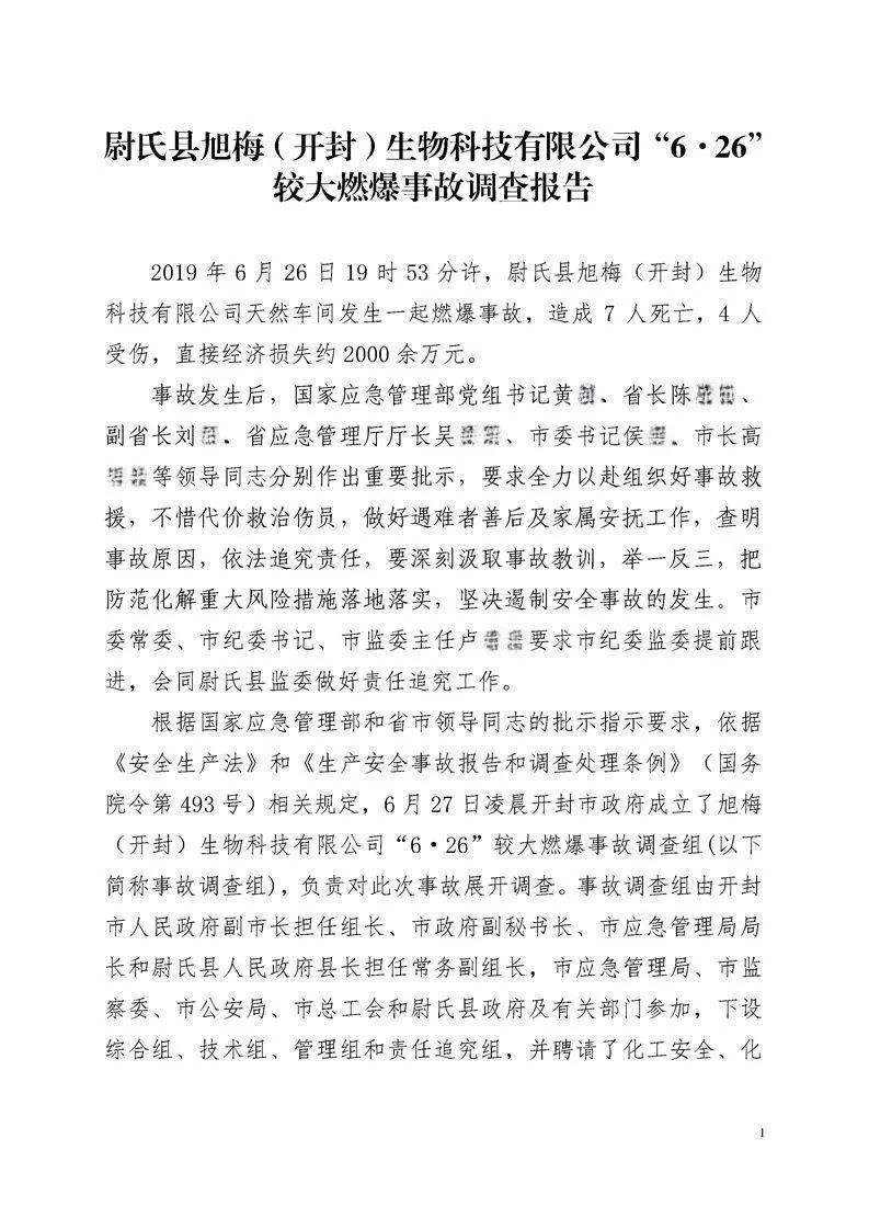 近日,河南省应急管理厅公布了尉氏县旭梅(开封)生物科技有限公司(以下简称“开封旭梅公司”)在6月26日发生的一起较大燃爆事故的调查报告。事故调查组认为,这起事故属于生产安全责任事故。根据事故调查报告,7人因涉嫌犯罪被司法机关采取措施,2名相关企业责任人被建议处理。其中,1人被建议移交司法部门处理,1人被建议公安机关对其立案调查处理。