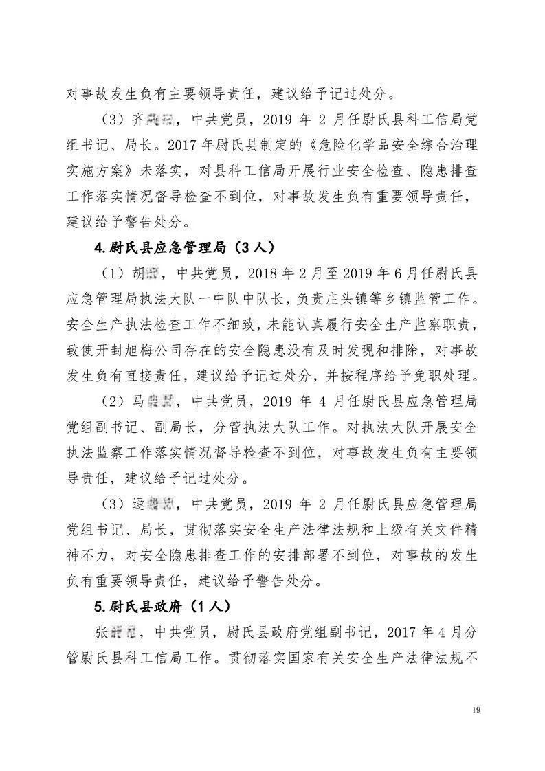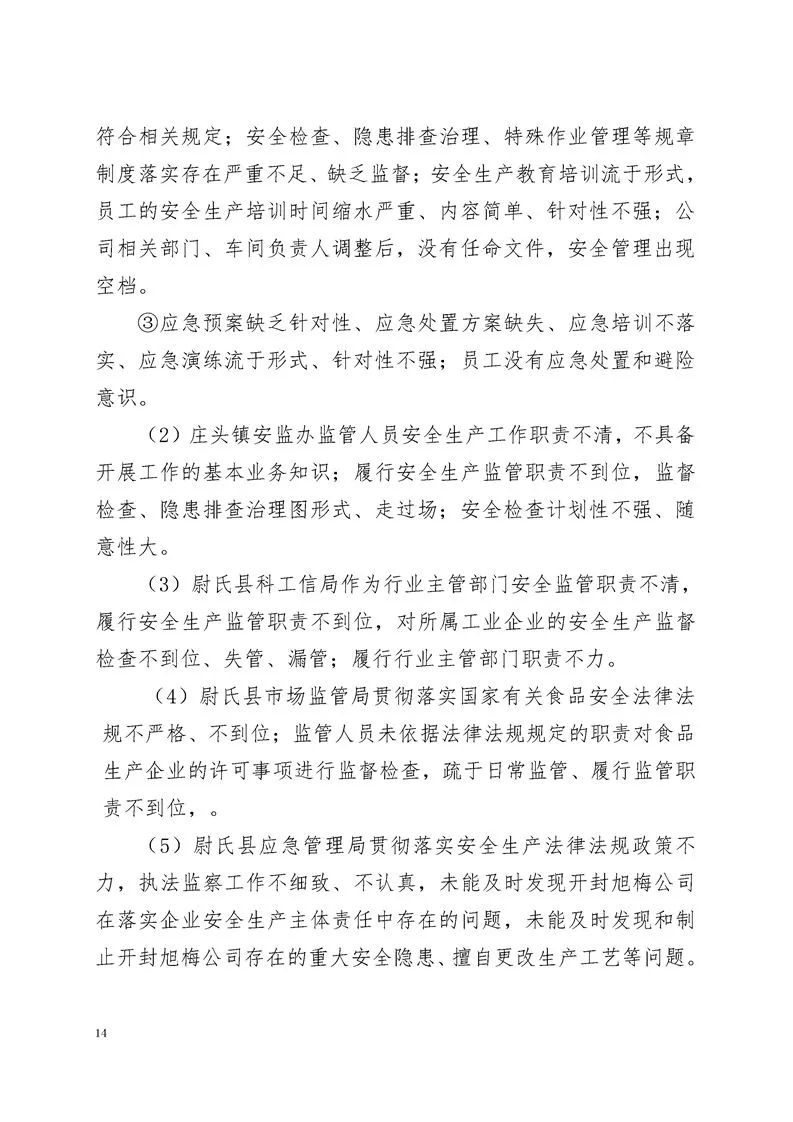 (5)尉氏县应急管理局在贯彻落实安全生产法律法规政策方面不够有力。执法监察工作不够细致、认真,未能及时发现开封旭梅公司在落实企业安全生产主体责任中存在的问题。未能及时发现并制止开封旭梅公司存在的重大安全隐患,如擅自更改生产工艺等。