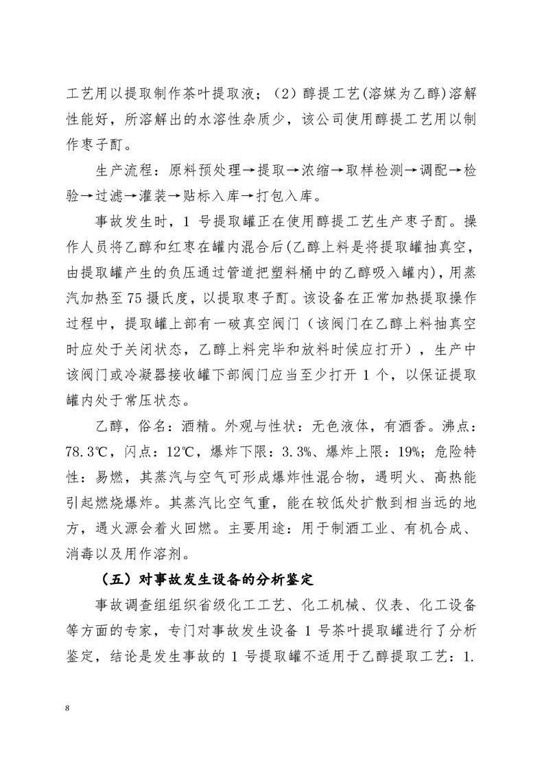 根据调查,在交接班时,工人们发现1号提取罐底部出现了泄漏。几名工人迅速上前封堵。然而,在封堵过程中,大约在19时53分,由于提取罐的破真空阀和冷凝器接收罐下部阀门均未打开,罐内物料的加热导致罐内压力不断升高。最终,罐内物料从罐底泄漏,直至将提取罐底部的快开式卸料口放料盖爆开。大约1000千克的乙醇和240千克的红枣从罐底泄漏,并被静电引燃。乙醇气体在挥发过程中遇到明火发生爆炸(高温液体乙醇快速挥发成乙醇蒸汽,与车间内空气形成爆炸性混合物)。此外,西墙窗下存放的约1200千克桶装乙醇以及装置区周边存放的提取液也被引燃,火势进一步扩大和蔓延,造成了7人死亡、4人受伤的较大事故。 希望我的修改能够帮到你。