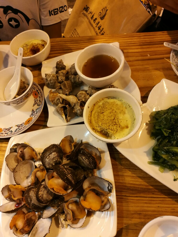 在海边,品尝海味。