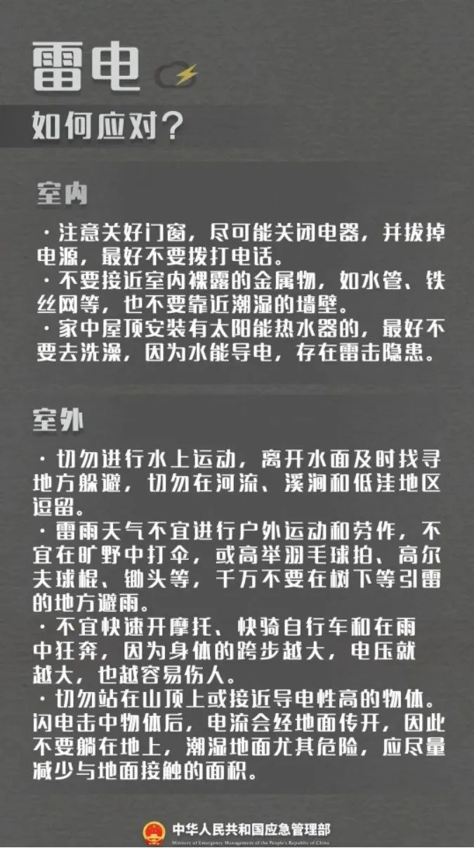 :2.请注意强对流天气的影响。政府和相关部门应按照职责做好防雷和防风工作。高空、水上、田间等户外作业人员在遇到强对流天气时应立即停止作业。户外行人应远离棚架广告牌等搭建物,并尽量躲入有防雷设施的建筑物或汽车内。在雷雨时,不要在大树或高耸孤立物下避雨或接打手机。