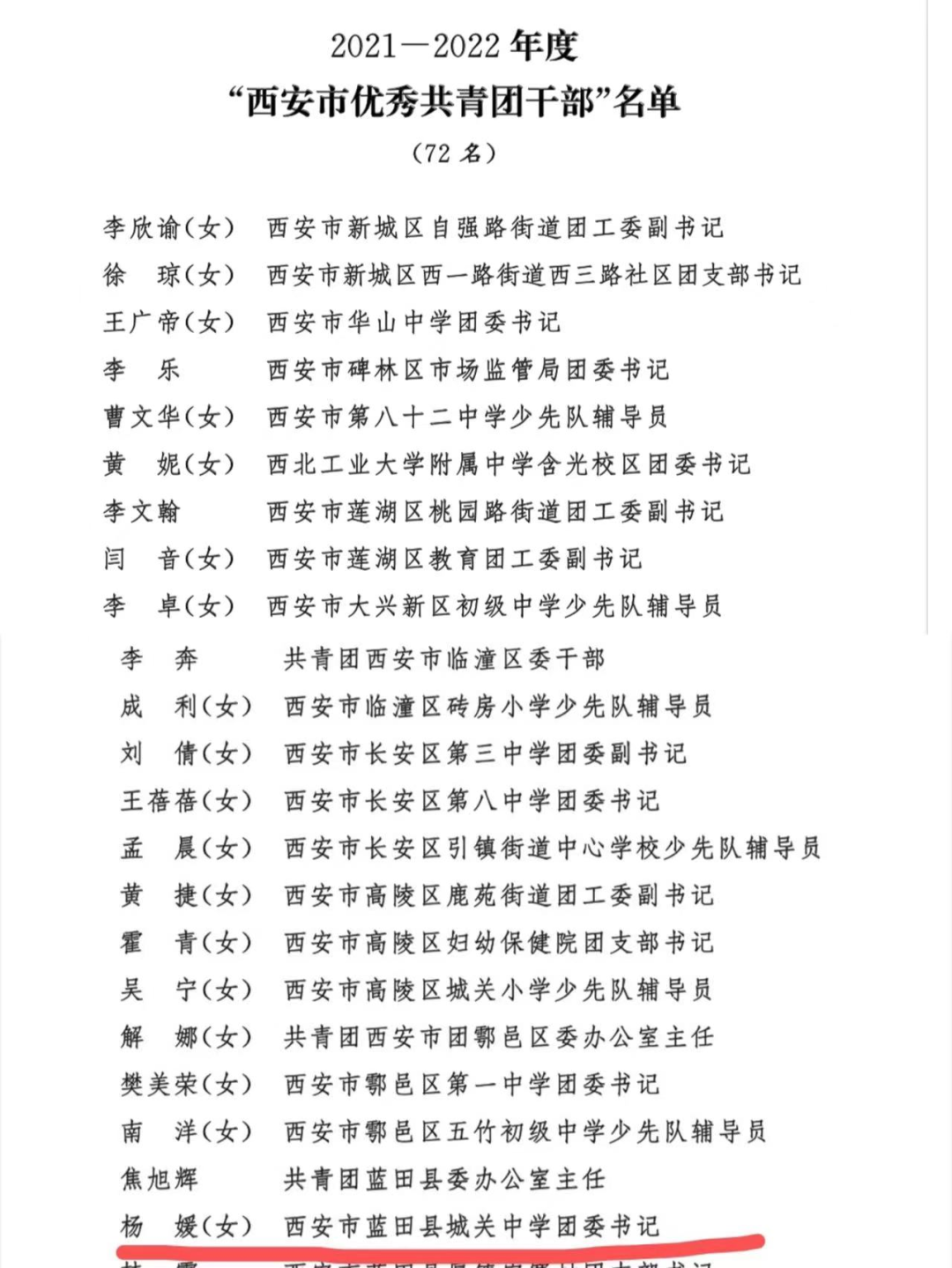 近日,共青团西安市委对一批优秀集体和个人进行了表彰。其中,蓝田县城关中学团委书记杨媛被共青团西安市委评为"西安市优秀共青团团干部"。