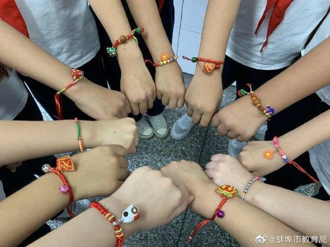 中国人自古以来就非常崇敬五色,因为它们被视为吉祥的颜色。五彩绳就是幸福的象征,它表达了人们对于健康和平安的美好愿望。在活动现场,每个人都挑选了自己喜欢的编织绳颜色进行搭配。他们用左手固定轴线,右手绕线编织花形。随着手中的材料一点点打结、编花,经过抽、拉、勾等一系列操作,一根根色彩鲜艳、造型美观的五彩绳手链就呈现在眼前。每个人都佩戴上自己亲手编织的手链,脸上都露出了幸福的笑容。