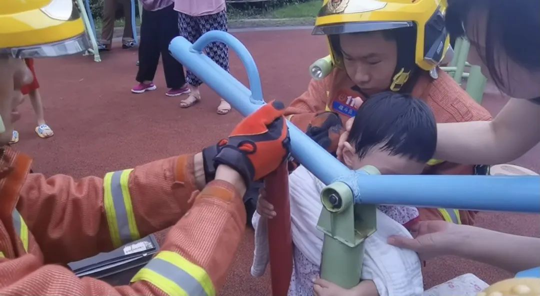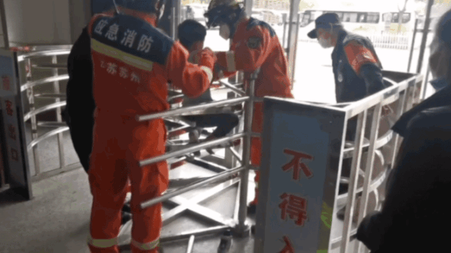 在太仓市汽车客运站,一名大约6岁的小男孩被困在检票口的单向旋转门内。消防员迅速拆除栏杆,将小男孩救出。