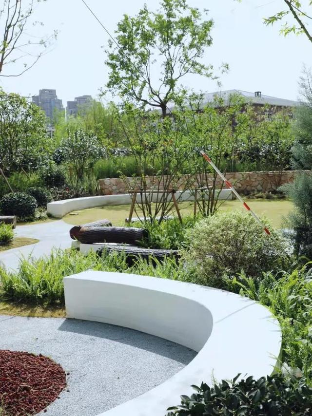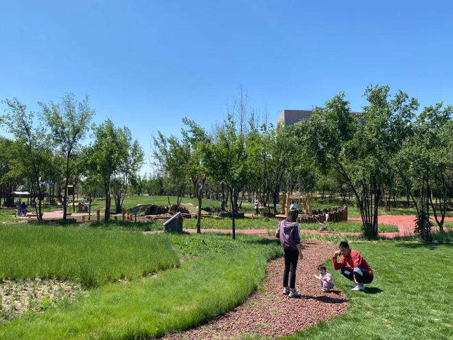 树木葱郁,草地茵茵,公厕整洁,儿童嬉戏,休闲区内