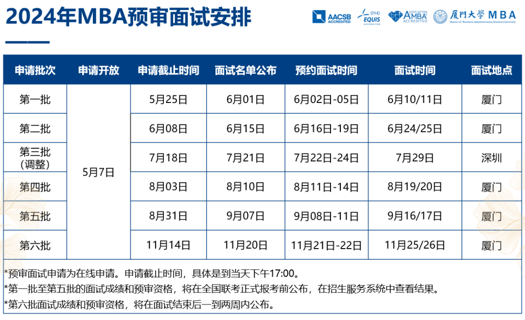 因中心招生工作安排,经研究决定调整2024入学厦大MBA第三批预审面试时间,面试时间由7月22-23日延期至7月29日进行,第三批面试申请的截至时间也由7月6日顺延至7月18日。