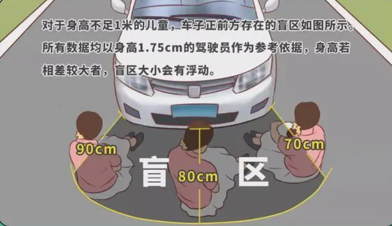 由于SUV车型相较于普通轿车更高,因此其盲区范围也更大。如果儿童进入车辆盲区或蹲在车旁玩耍,很容易引发交通事故。此外,加长、加宽的货车也存在更大的视觉盲区。