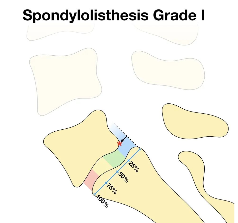 I度:椎体向前滑移的程度不超过椎体中部矢状径的1/4(0-25%)。