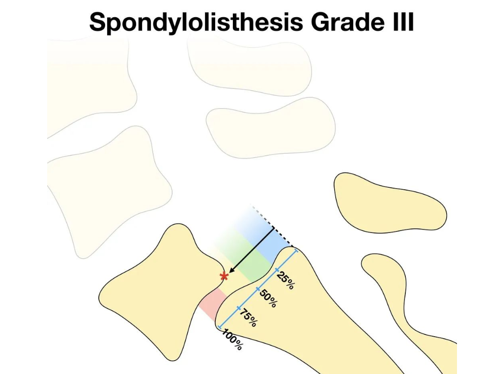 辑:第三度:椎体向前滑移的程度超过了椎体中矢状径的2/4,但不超过3/4(50-75%)。