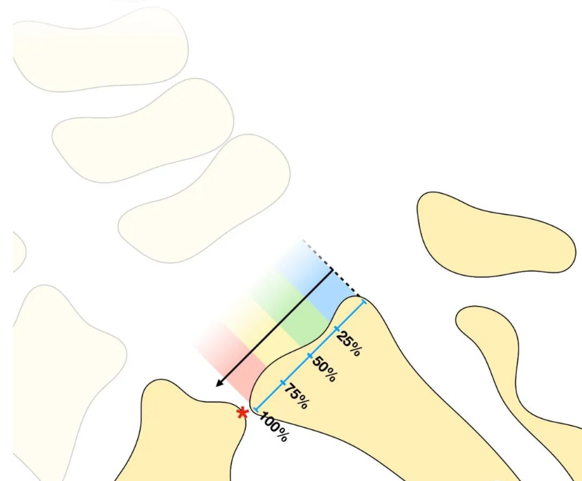 将下位椎体上缘分为4等分,根据上位椎体对下位椎体向前滑移的程度进行分级。